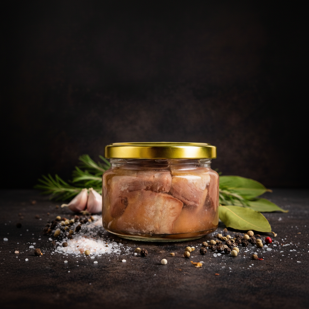 | Состав | Свинина, соль поваренная пищевая, перец чёрный горошек, лавровый лист |